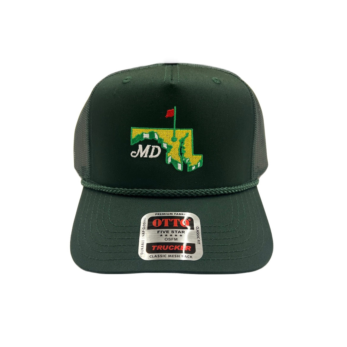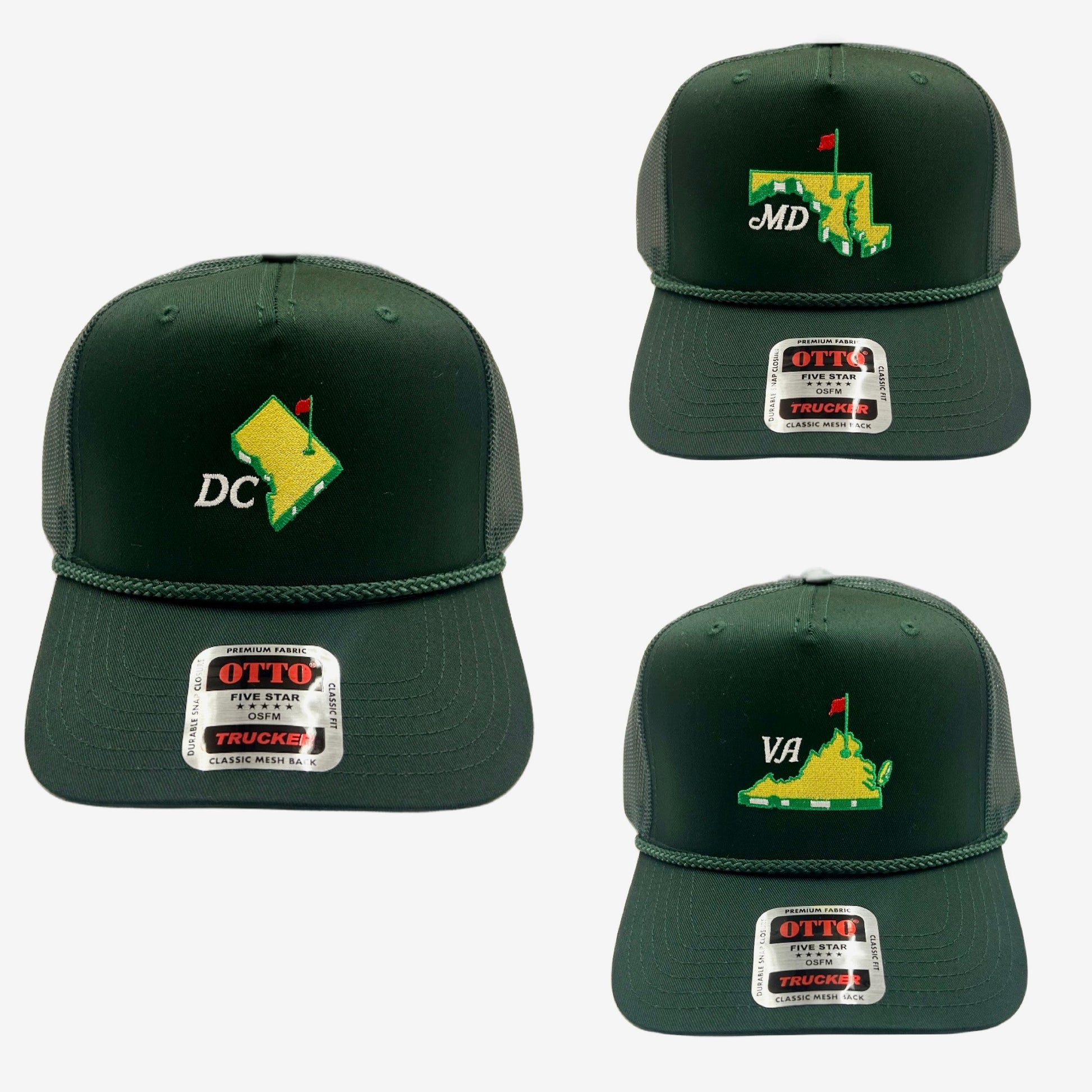 If you love golf and you love the DMV, this should be your new favorite Trucker hat! It's a hip, mid-rise trucker hat with matching Forest green rope & mesh backing.